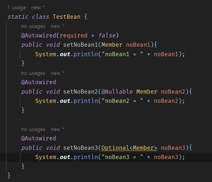 - Optional<> : 자동 주입할 대상이 없으면 Optional.empty가 입력된다.