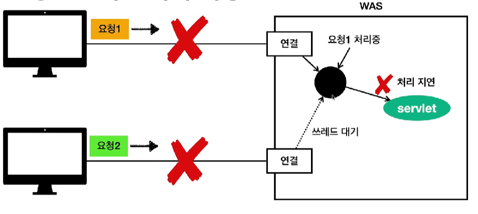 요청이 오면 쓰레드할당하여 서블릿을 호출한다. 하지만 다중 요청인 경우, 첫번째 요청의 처리가 지연되고 있다면, 두번째 요청은 쓰레드가 현재 첫번째 요청에 대해 할당되어 하나밖에 없기때문에, 계속 대기가 일어난다.. 첫번째 요청이 계속 지연된다면 일반적으로 어떤 처리 오류가 발생한 것이고 이렇게 되면 결국 첫번째 요청과 두번째 요청 둘다 응답을 실패하게 된다.