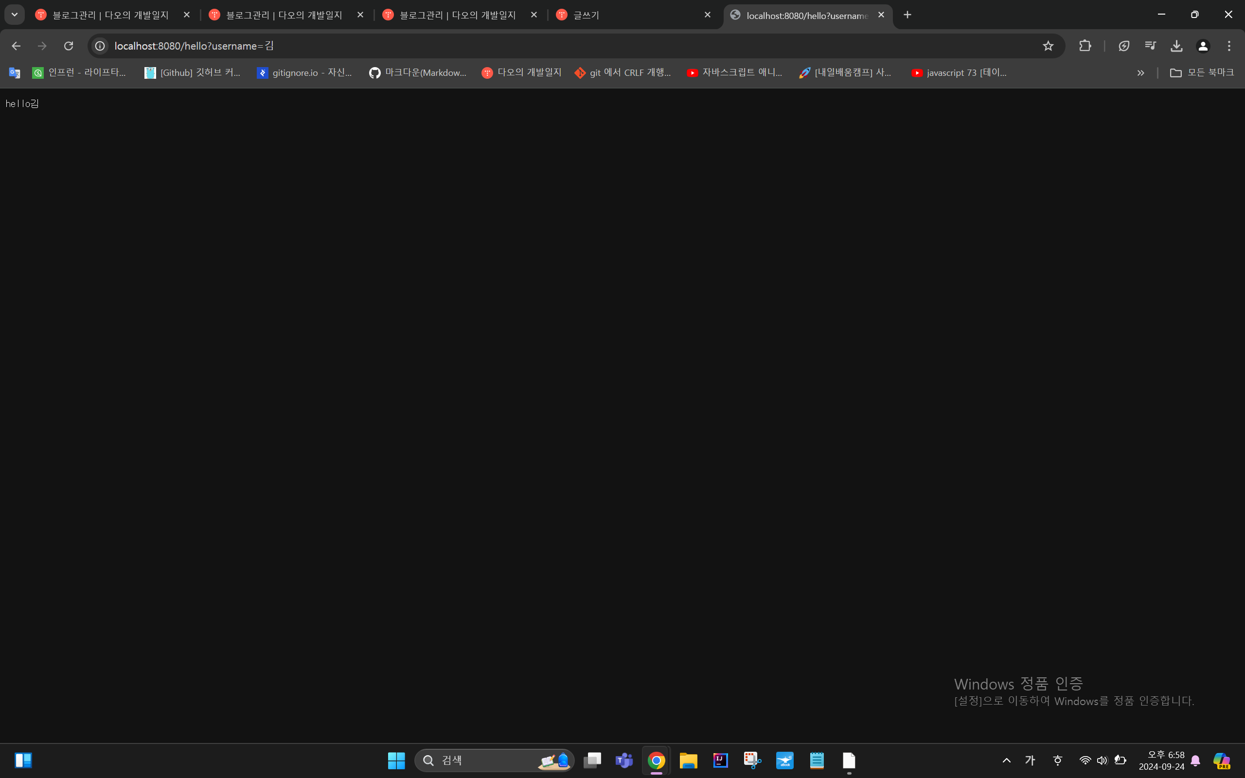 실행 후 http://localhost:8080/hello?username=김 으로 들어가보자