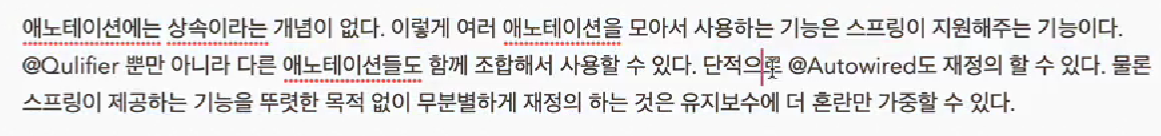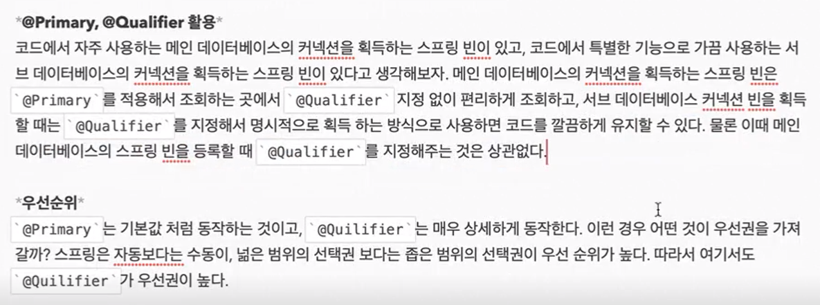 @Qualifier추가 구분자를 붙여주는 방법이다. 주입 시 추가적인 방법을 제공하는 것이지 빈 이름을 변경하는 것은 아니다.