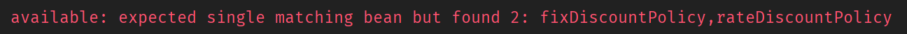 이제 @Autowired로 DiscountPolicy를 주입 받을려고 하면 아래와 같은 충돌이 일어나게 된다.