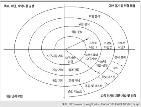 - 가장 중앙의 원을 타당성 조사 단계, 다음 원은 요구사항 정의 단계, 다음 원은 설계 단계 ~
