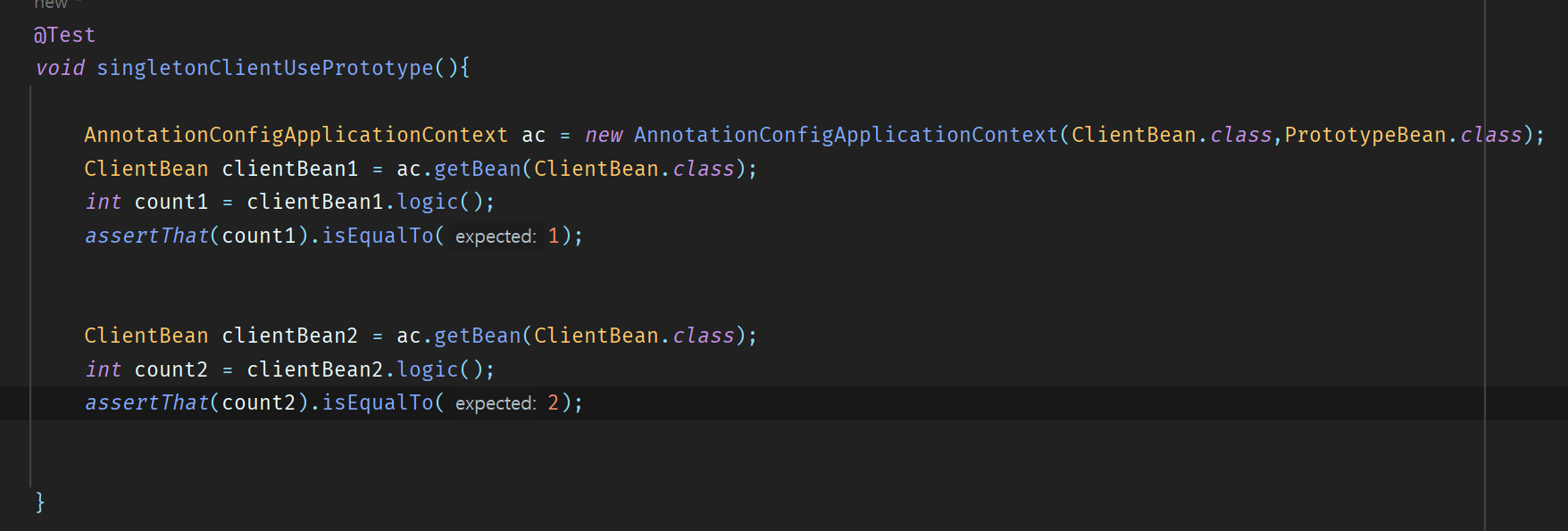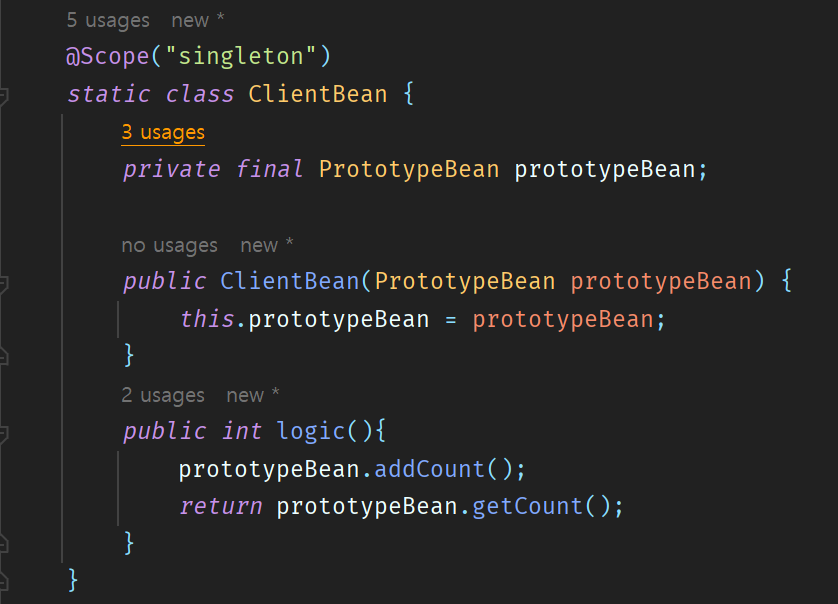 이번에는 'clientBean'이라는 싱글톤 빈이 의존관계 주입을 통해서 프로토타입 빈을 주입받아서 사용하는 예를 보자.