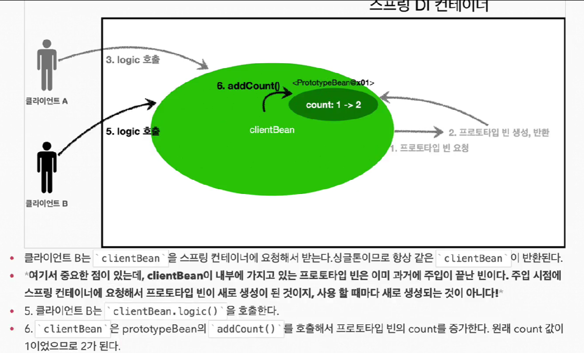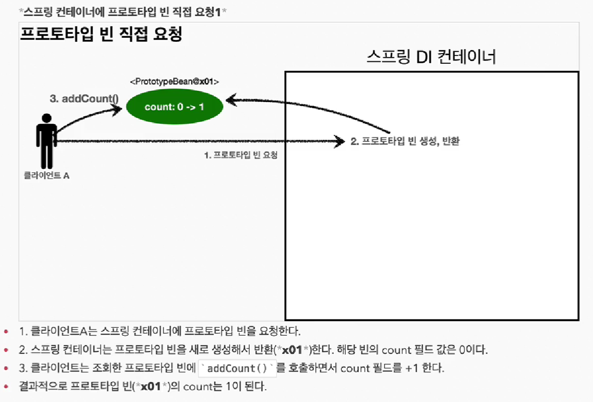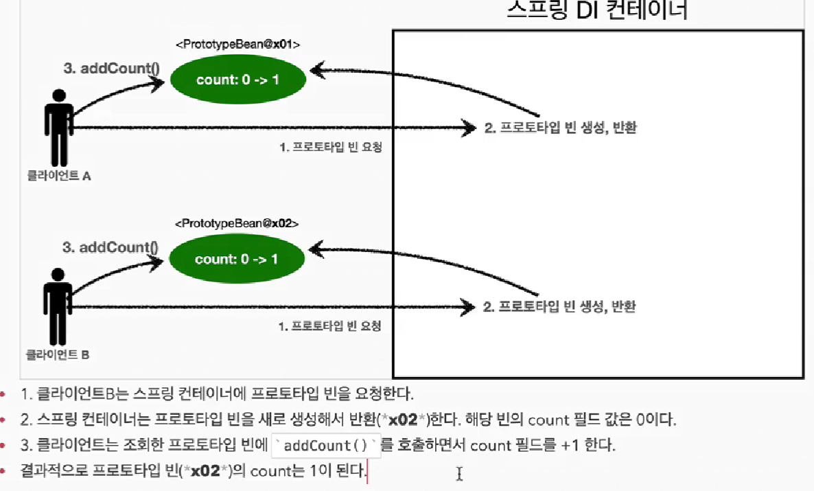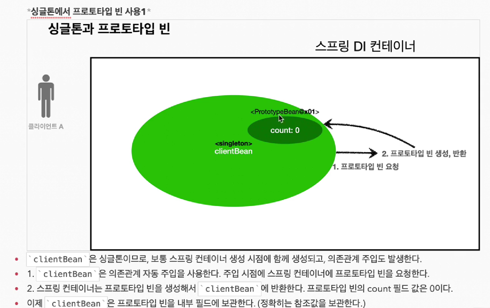 스프링 컨테이너에 프로토타입 스코프의 빈을 요청하면 항상 새로운 객체 인스턴스를 생성해서 반환한다. 하지만 싱글톤 빈과 함께 사용할 때는 의도한 대로 잘 동작하지 않으므로 주의해야한다. 그림과 코드로 설명하겠다.