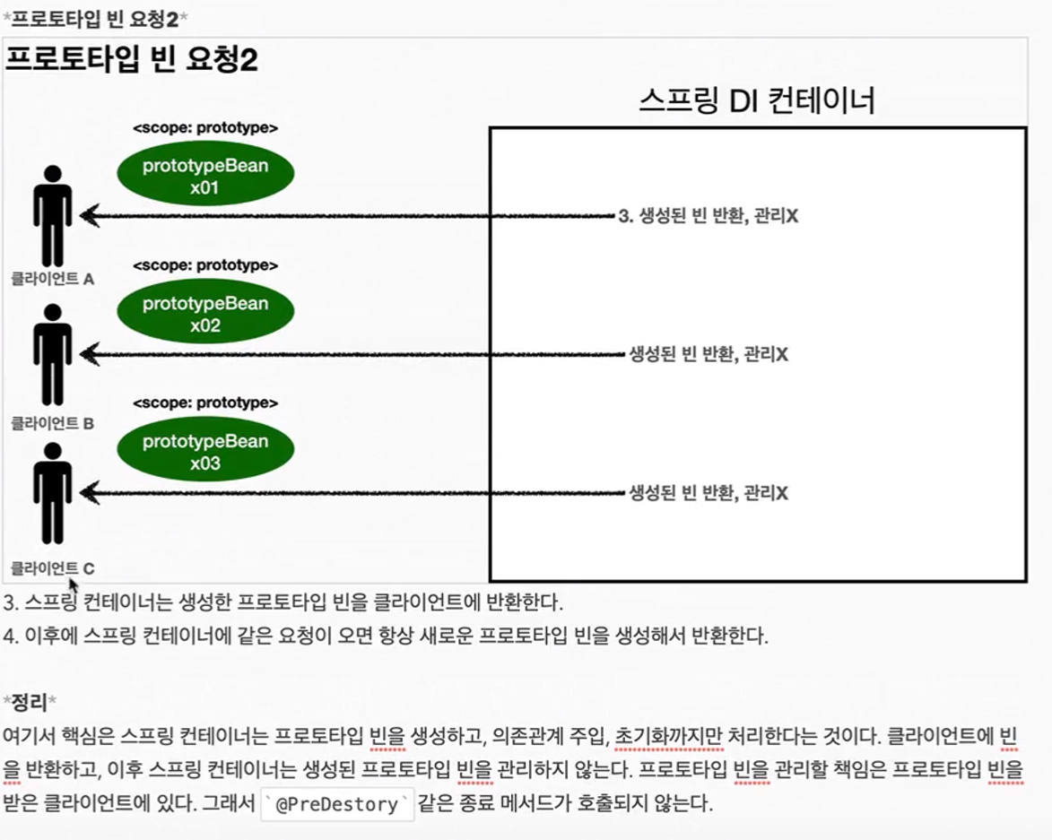 종료 메서드가 호출되지 않는다. 그래서 프로토타입 빈은 프로토타입 빈을 조회한 클라이언트가 관리해야 한다. 종료 메서드에 대한 호출도 클라이언트가 직접 해야한다.