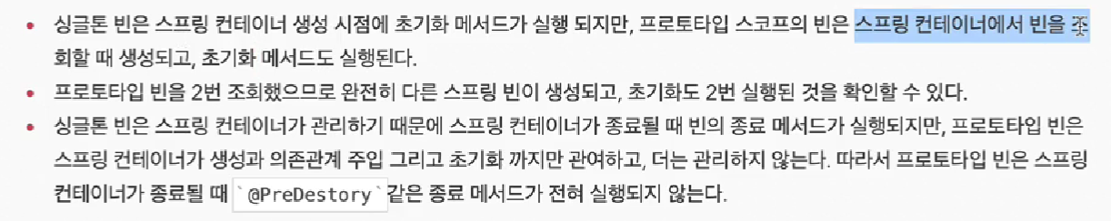 스프링 컨테이너는 프로토타입 빈의 생성과 의존관계 주입 그리고 초기화 까지만 관여한다.