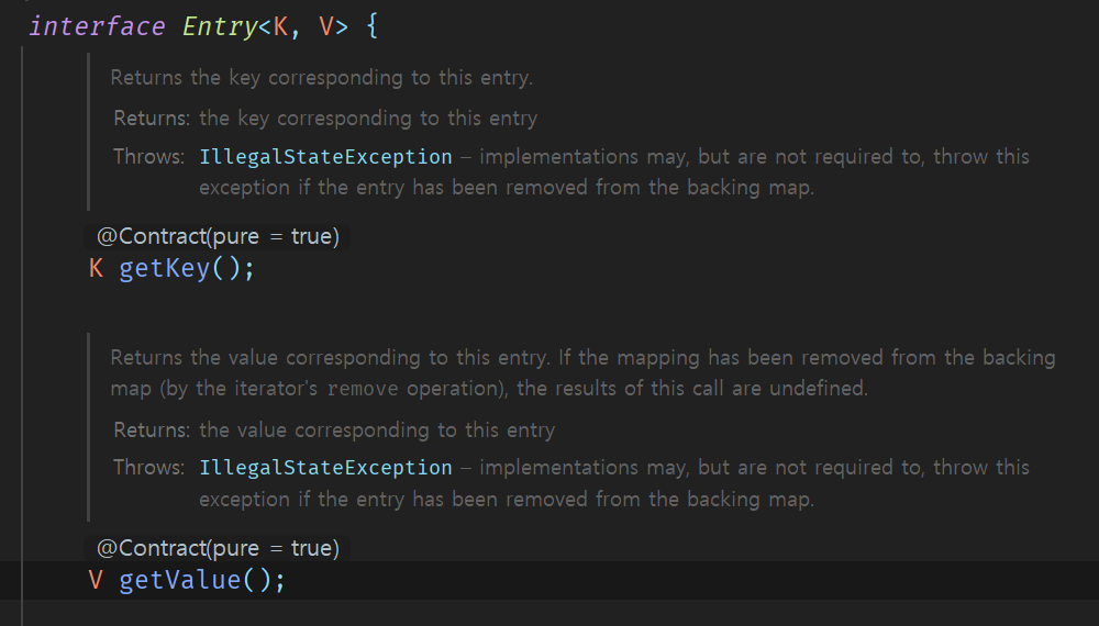 또한 안에 interface Entry가 있었고 거기안에 getKey 메서드와 getValue 메서드를 확인할 수 있었다.