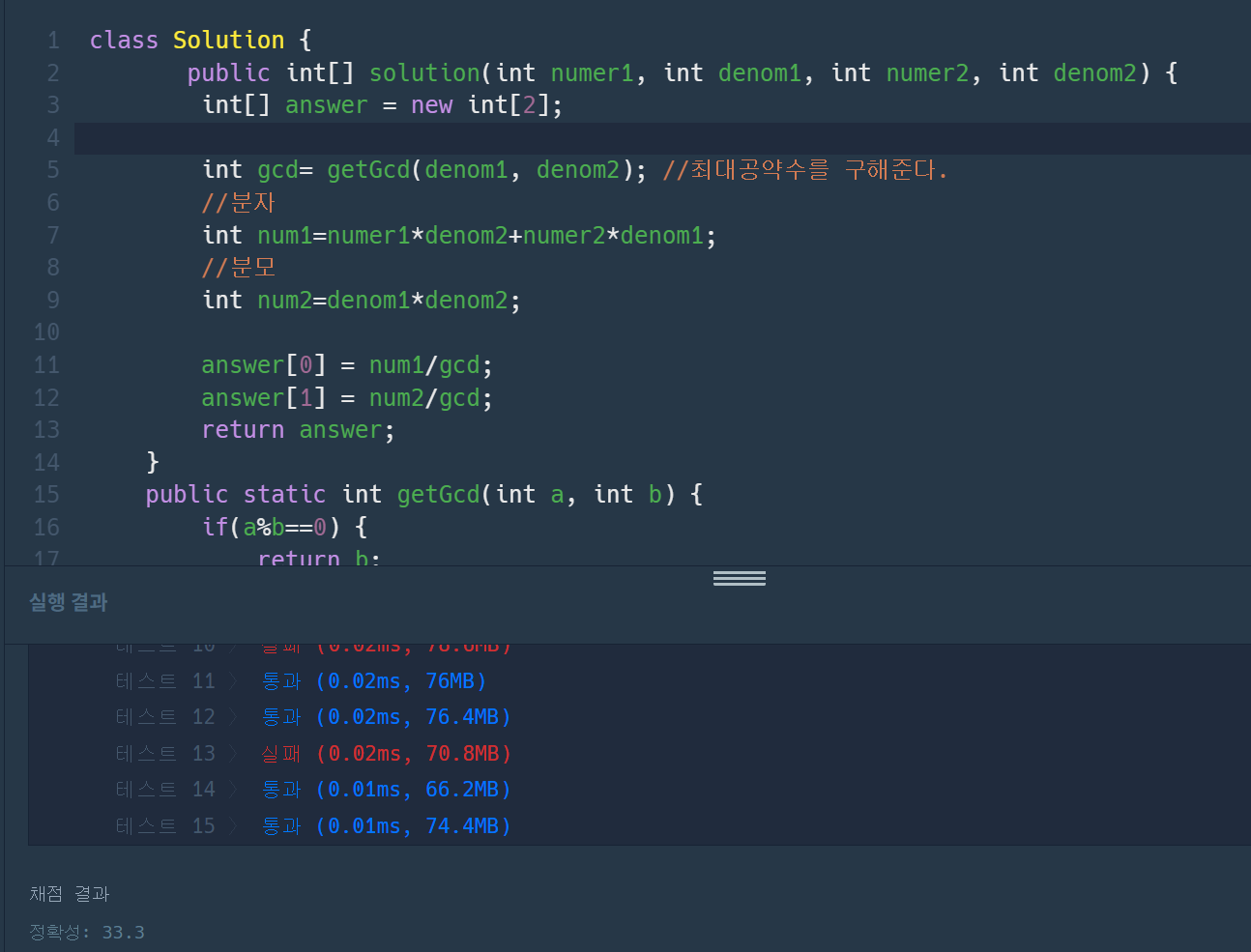 원인은 getGCD의 인수(argment)에 있었다.. 분자 분모 num1과 num2를 먼저 구한 후 인수에 넣어야 했지만 인수를denom1,denom2를 넣어버린 실수를 저질렀다.
