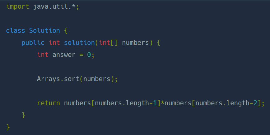 이 문제는 파라미터로 넘어오는 배열에서 순서대로 최대값 2개를 서로 곱하여 리턴하는 함수이다.