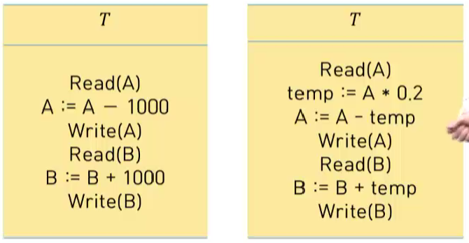- T: 계좌 A의 잔고에서 20%를 B로 이체