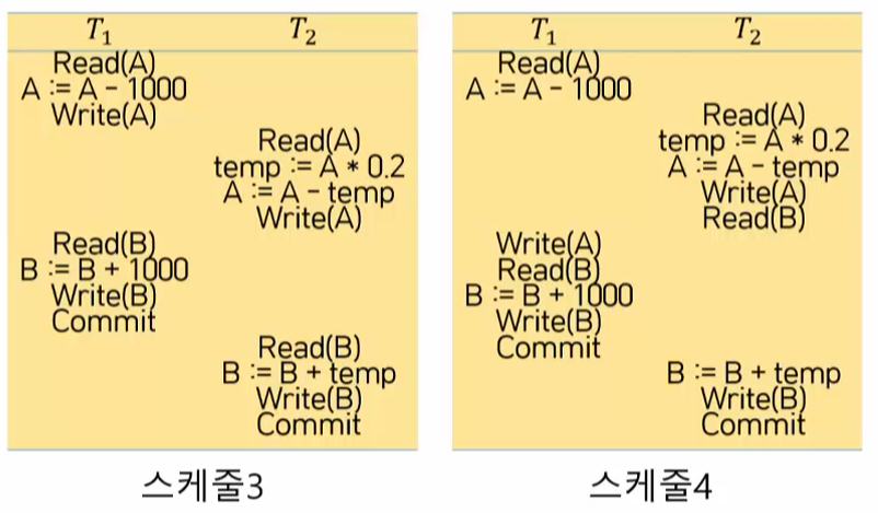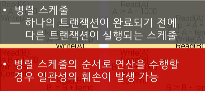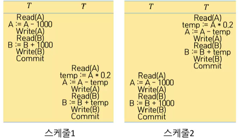 - 복수개의 트랜잭션이 동시에 수행된 결과가 직렬 수케줄의 결과와 통일한 스케줄