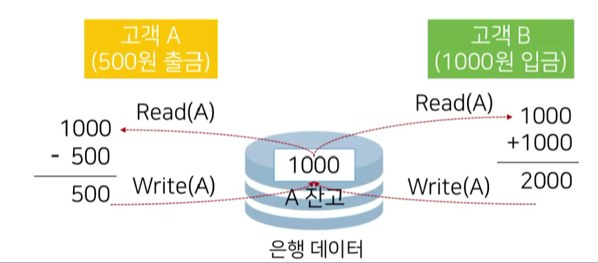 - 다중 사용자 환경에서 트랜잭션 동시 실행으로 데이터 갱신 시, 일관성 훼손 문제가 발생