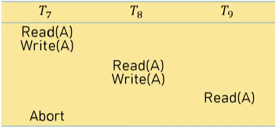 READ(B)에서 문제가 발생했지만 T6에서 벌써 Commit이 되었기 때문에 지속성에 의해 READ(A)의 값을 되돌릴수 없다