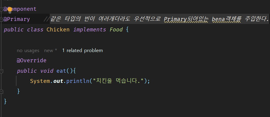 예를들어 식당에서 Chicken Bean의 사용비율이 95퍼센트가 되고 Pizza Bean의 사용비율이 5퍼센트가 된다면 Chicken Bean에 @Primary를 Pizza Bean에는 @Qualifier를 사용해주자