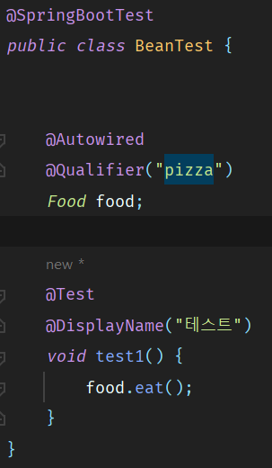 pizza라고 써놓은 해당 bean객체를 test시에 @Qualifier를 붙혀줌으로써 주입받 수 있다.