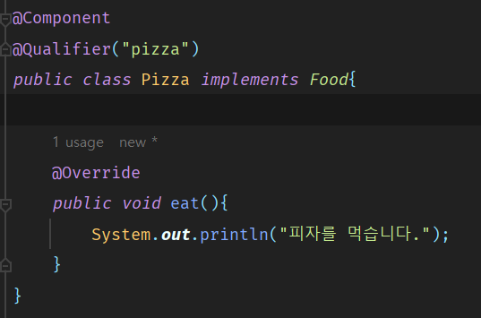 @Qualifier로 호칭을 붙힌다. 여기선 pizza로 두었다.