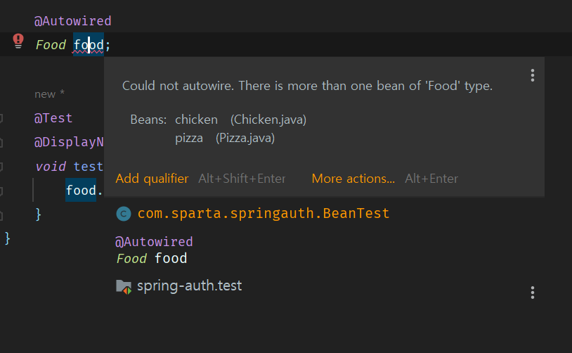 같은 타입의 bean이 2개 이상이기 때문에 @Autowired를 달아도 다음과 같은 오류가 뜬다