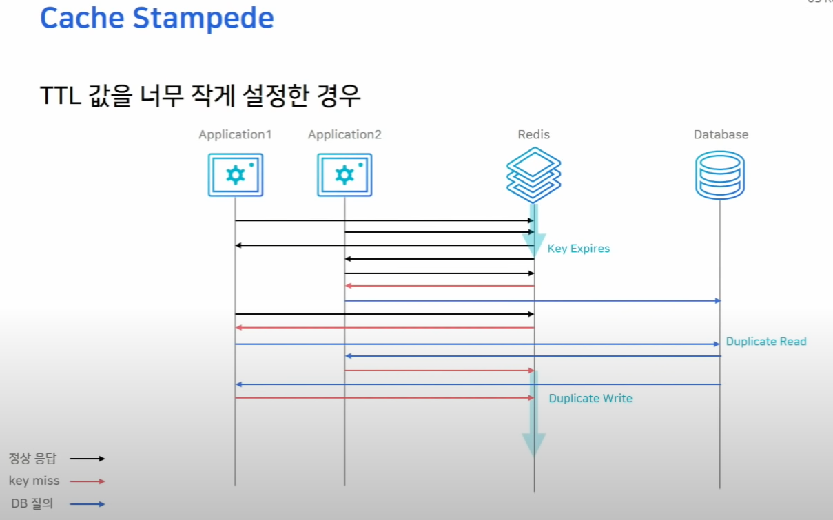 Cache Stampede 현상 : Look-Aside(Lazy-Loading)를 통해 DB에 있는 데이터를 캐시에 저장한다. 하지만 Key가 만료 되는 순간, 많은 서버에서 이 Key를 같이 보고 있었다면, 모든 애플리케이션 서버들이 DB에 동시접근해서 같은 데이터를 찾게 되는 Duplicate Read가 발생하게 된다. 또한 읽어온 값을 각각 Redis에 쓰는 Duplicate Write또한 발생한다.