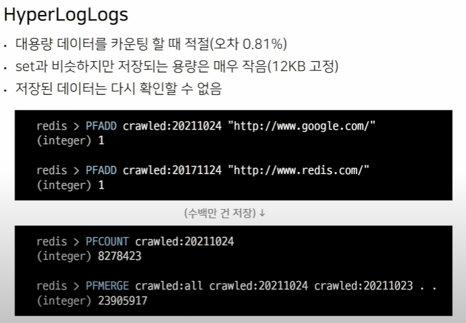 - HyperLogLogs : 많은 데이터를 다룰때 주로 쓰이며, 중복되지 않는 값의 개수를 카운트할 때 사용된다.