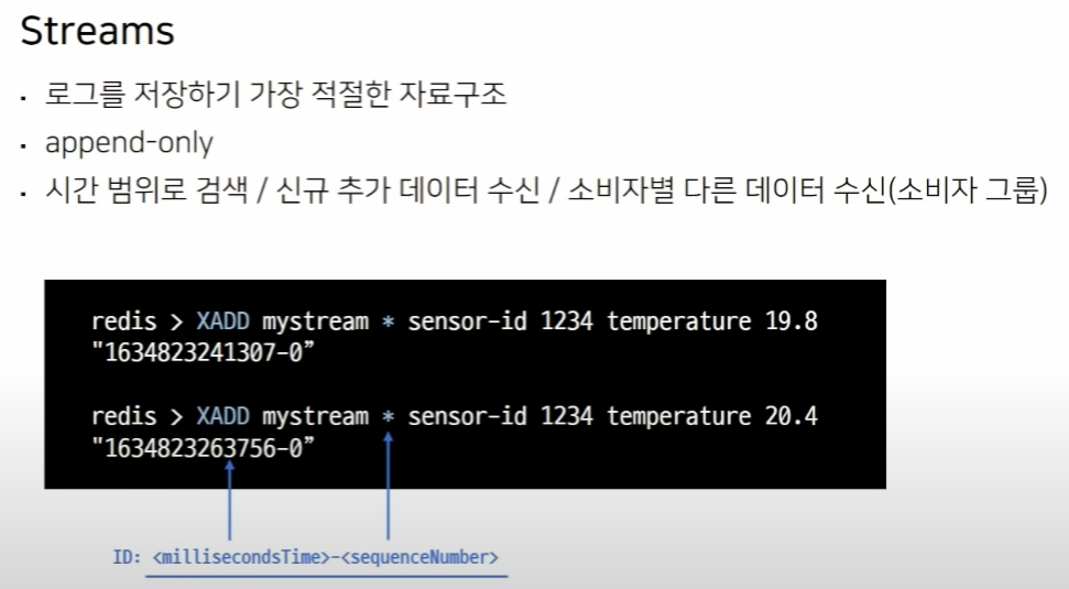 - Streams : 로그를 저장하기 가장 좋은 자료구조이다.