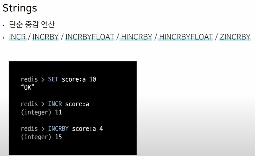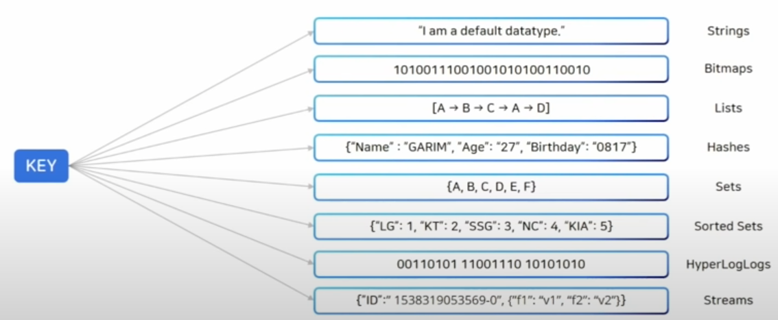 - Strings : 제일 기본적인 문자열 데이터타입, setCommand로 저장하는 데이터는 모두 Strings로 저장한다.