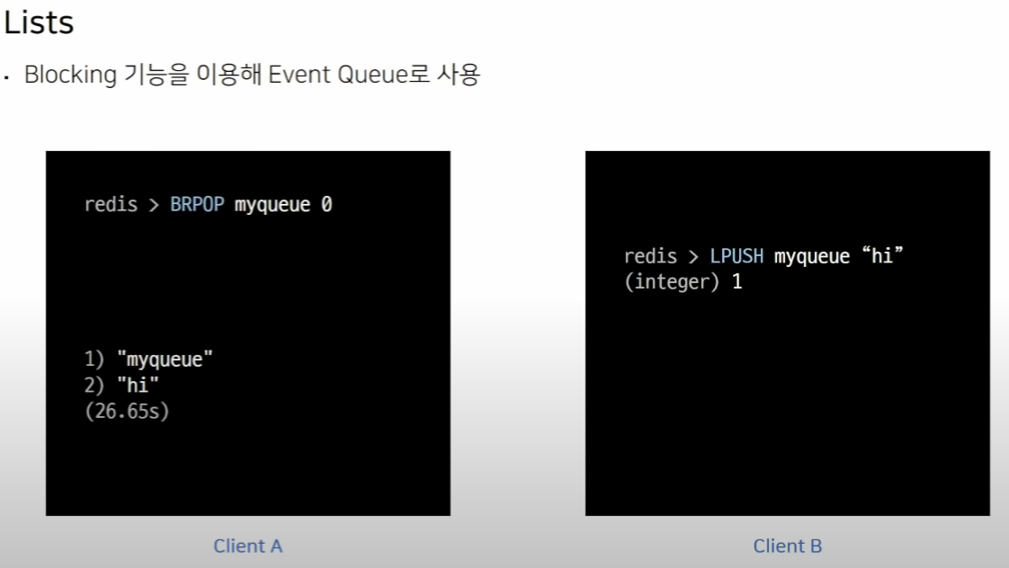 Redis의 Lists는 메시지 큐로 사용하기 적절하다. 특히 자체적으로 blocking 기능을 제공하기 때문에, 적절히 사용하여 불필요한 polling을 막을 수가 있다.