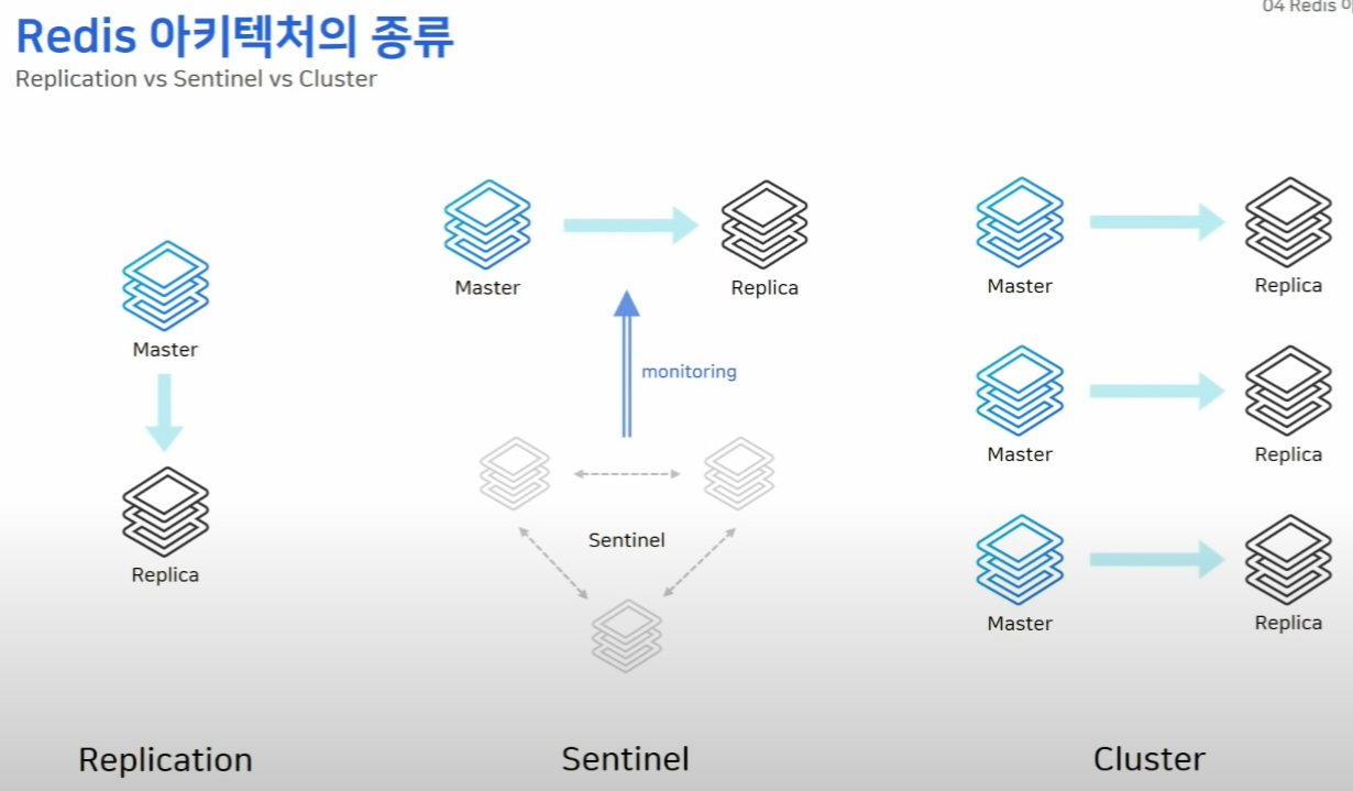 Sentinel : 마스터와 복제가 존재 추가로 센티널 노드가 필요하다. 센티널은 일반 노드들을 모니터링 한다.