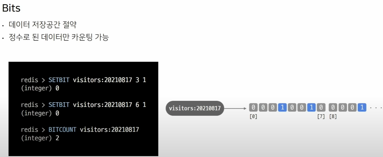 - Bitmaps : Strings의 변형이라도 볼 수 있고, 비트연산이 가능하다.