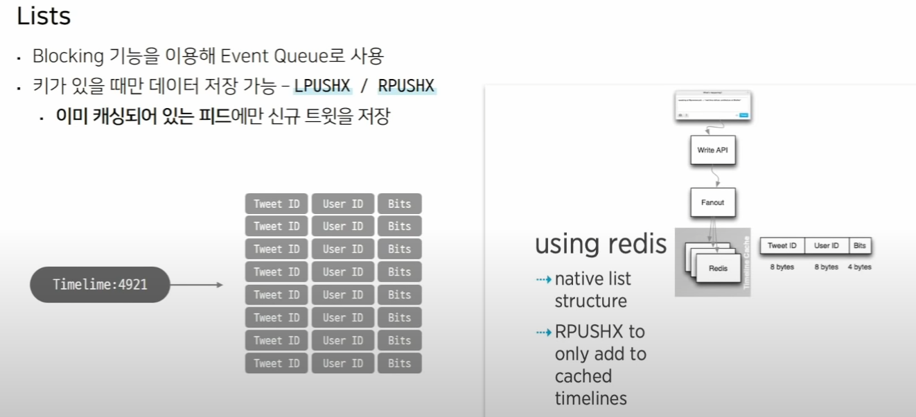 인스타그램, 페이스북 SNS에는 유저별로 타임라인이 존재하고, 내가 팔로우 한 사람들의 데이터가 나오는데, 트위터에서는 각 타임라인에 뜨는 트윗을 캐싱하기 위해 레디스의 Lists를 사용하는데, 이때 RPUSHX 커맨드를 사용한다. 이를 이용해서 트위터를 자주 이용하던 유저의 타임라인에만 새로운 데이터를 미리 캐시해 놓을 수 있으며, 자주 사용하지 않는 유저는 caching key 자체가 존재하지 않기 때문에, 그런 유저들을 위해 데이터를 미리 쌓아놓는 것과 같은 비효율적인 작업을 방지할 수 있게 된다.