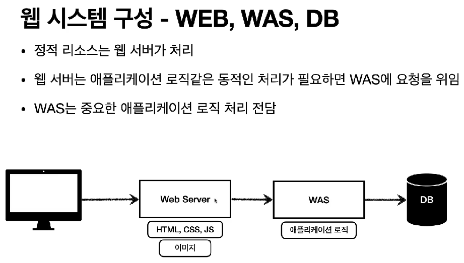 WAS는 정적 리소스, 애플리케이션 로직 모두 제공 가능하기 때문에 WAS만으로 웹시스템을 구성할 수 있다. 하지만, WAS가 너무 많은 역할을 담당하면서, 서버의 과부하가 올 수 있다. 가장 비싼 애플리케이션 로직이 정적 리소스 때문에 수행이 어려울 수 있다. WAS 장애 시 오류 화면도 노출 불가능하다. 비용 또한 증가한다.
